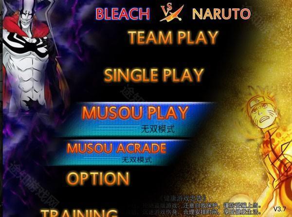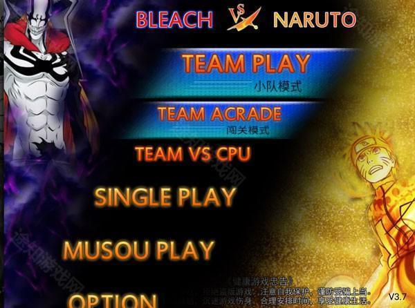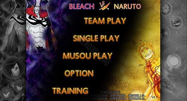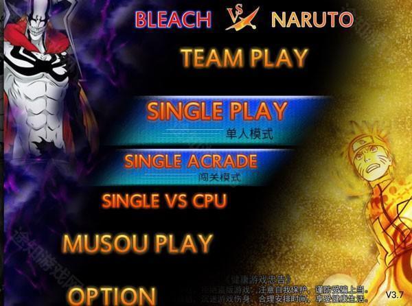 1. 开启《死神vs火影》游戏,进入玩法选择界面,其中包含小队模式(TEAM PLAY)、单人模式(SINGLE PLAY)、无双模式(MUSOU PLAY)。