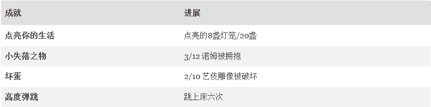 提示:游戏里能找到13个诺姆。把这13个都拥抱过,你就能解锁“小失物”成就啦。