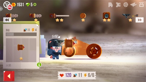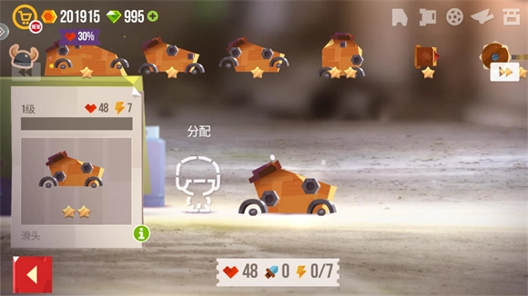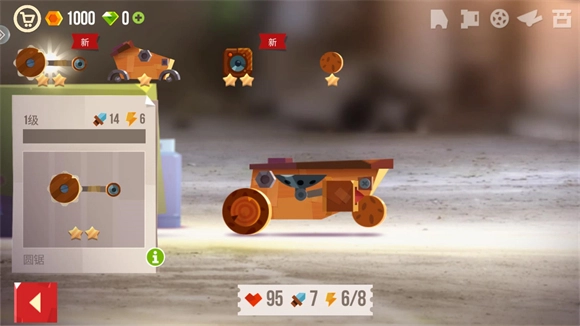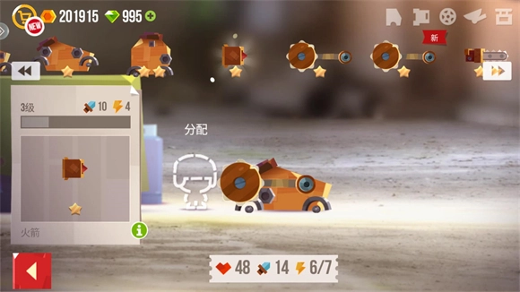 3、改装界面上方展示的是可使用的配件,点击即可将其装配到车身上;界面下方则显示车辆的各项属性,具体包括血量、攻击和电量。