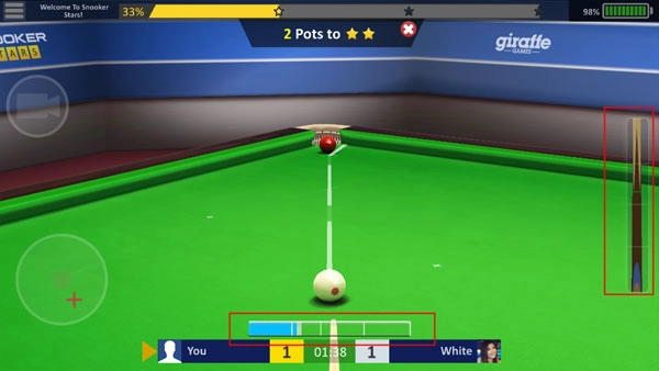 3、确认好台球能够打进洞后,点击右边的球杆开始蓄力,不同的力度同样决定了台球是否会打进洞。