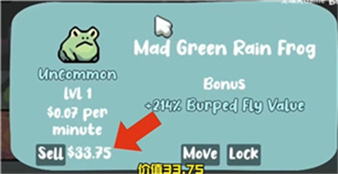 现在我是一只稀有的疯狂绿雨蛙,身价33.75呢。挺不错的,10块入手的现在能卖三倍价,刚才吃了几只金色苍蝇,正好可以再买两只蛙蛙。