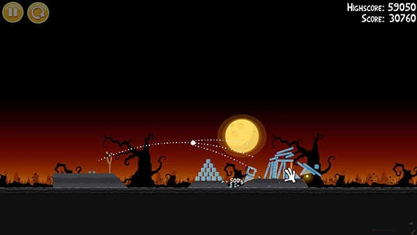 1-3:这一关开始有难度了,大概在玻璃堆前的树桩位置炸开小鸟,即可一鸟消灭所有小猪,并砸碎一定数量的玻璃方块!