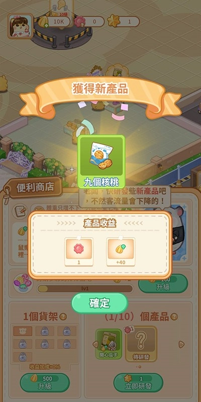 商品合成成功后,就能在超市上架新产品啦!超市里的产品种类越丰富,吸引来的顾客就越多,业绩自然也会越来越好哦!