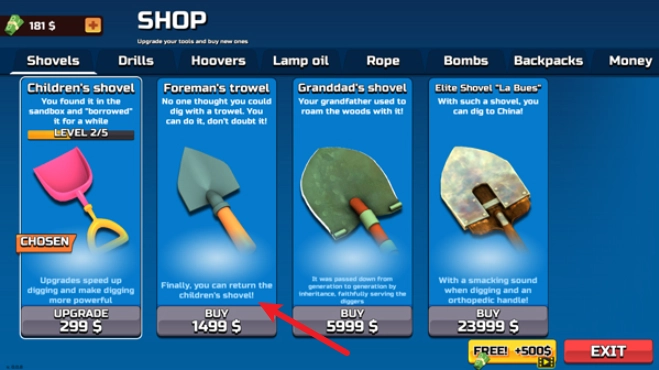 4、当积累到一定资金时,你可以在商店里购置性能更出色的铲具,或是绳索、爆破物这类辅助道具。
