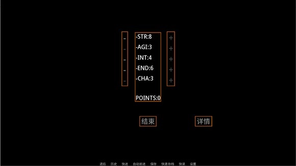 1. 初始属性配置:STR(力量)设定为8,AGI(敏捷)为3,END(耐力)为6,INT(智力)为4,CHA(魅力)为3。