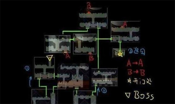 4、接着会来到另一个房间,这里有3个出入口:2个在最下方,分别在左侧和右侧;还有1个在最上方,选择最上方的那个进入。之后又会出现在另一个房间,同样有3个出入口,其中两个在中间位置(左右各一个),剩下一个在最下方靠左的地方,这次选择中间位置偏右的那个出入口进入。