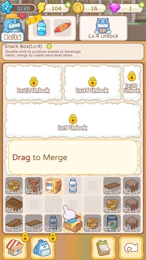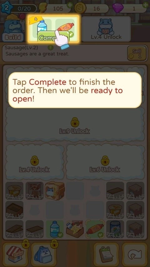 3、合成商品后,比如矿泉水或香肠,记得将它们上架,确保货架上商品充足。