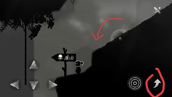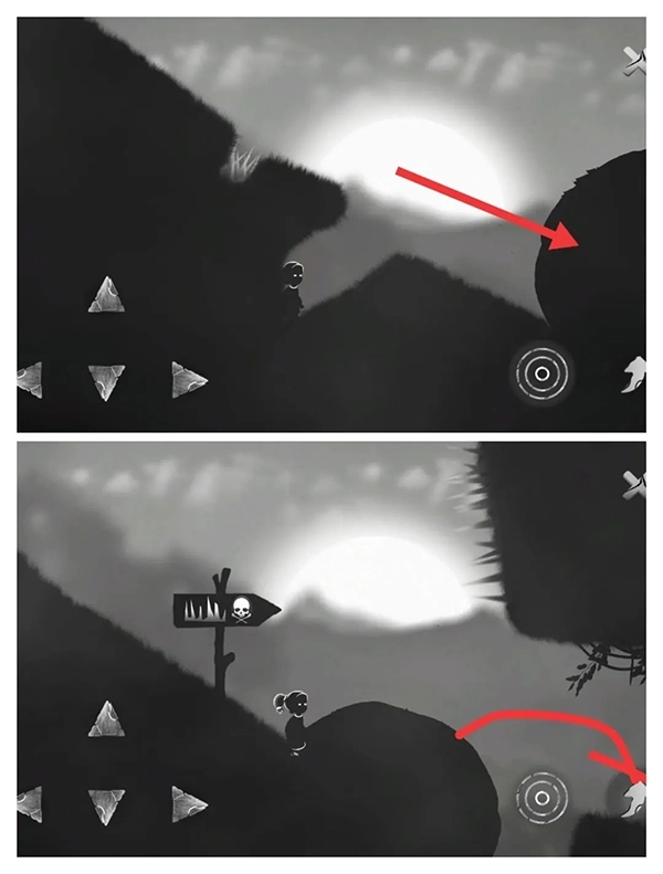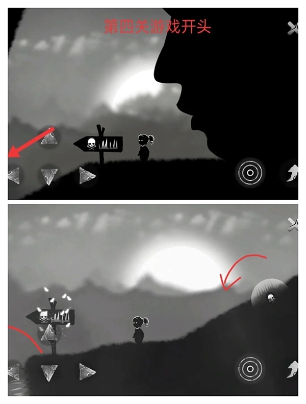 ①第三关开局右侧有个大骷髅,一碰就会直接失败。所以我们试着往左边攀岩移动