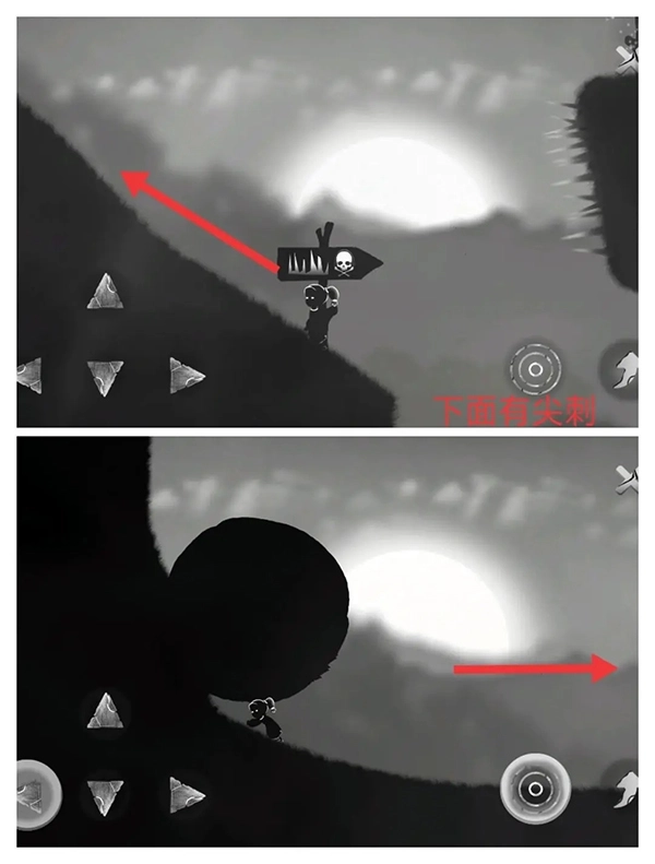 ④往右走到悬崖边时会遇到死神。要向左奔跑,在躲避尖刺的同时,还要留意别被死神抓住。