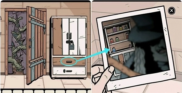 1、先从抽屉里取走一张照片,照片中女巫身后的架子上有我们所需的提示。