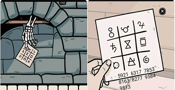 5、前往壁炉处,掀开覆盖在画框上的白布,触发剧情。随后,对壁炉使用对讲机,会收到一张纸条。仔细观察纸条上的符号,再结合收音机的频道数字,就能得出四个符号组成的密码。