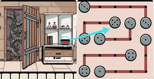 6、输入符号密码打开正大门右侧的柜子,接着点击右下方的红色盒子完成其上的机关(连连看),就能取出里面的白色宝石。