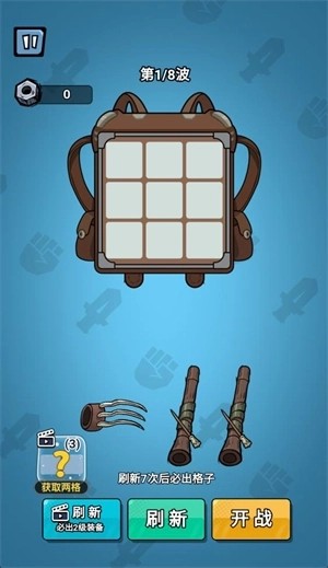 2、进入关卡后,玩家需将初始武器放置到背包的格子中;相同的武器能够通过合并来提升等级,点击刷新按钮则可获取新的武器。