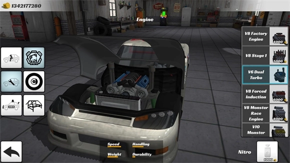 7、在主界面点击左下角的轮胎图标,即可进入车辆改装界面,在这里你可以更换各类配件,还能调整喷漆颜色。
