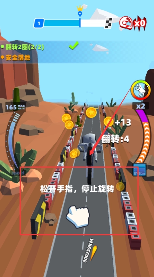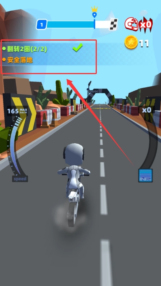 2、通过左右滑动来控制行驶方向,同时留意赛道上的加速带以实现瞬时提速,还要注意规避路面上的各类陷阱以确保安全行驶,最终完成初级关卡的挑战。
