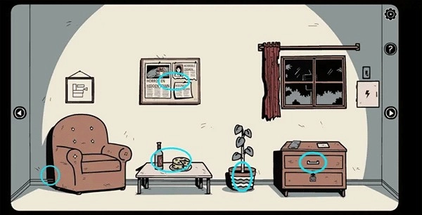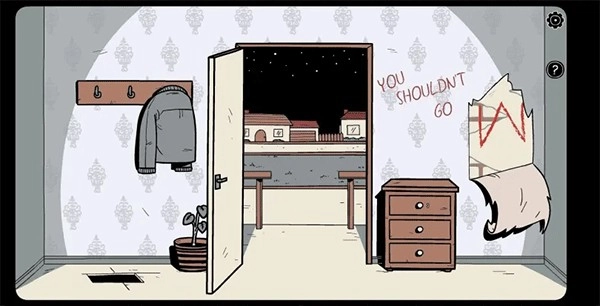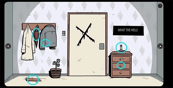 走到门前,用钥匙解锁抽屉并取出里面的手套;随后用玻璃碎片划破右侧墙壁的壁纸,再依据后续提示,打开被木板封住的门左侧的柜子,获取钥匙和开关。