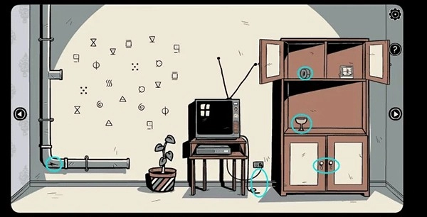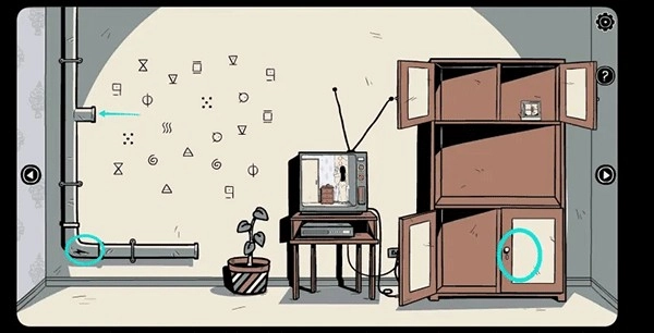 继续向左移动,取走架子上的「笔记本」和花盆中的「石头」,随后查看上方的提示,并把得到的纸条放置于该处。依据笔记本里的提示打开下方的柜子(需留意符号顺序可能会有变动),从而获取「镜子」。