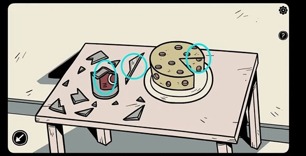 走到沙发旁,用石头敲碎酒瓶,拿到「钥匙」和「玻璃碎片」;之后把玻璃碎片和把手组合起来,再用这个组合工具切下一小块「芝士」。