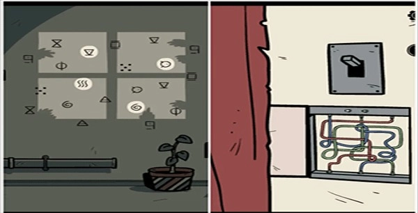 朝右侧转动后,找到窗户并操作使其窗帘闭合。随后借助手套完成右侧区域的线路拼接任务,并开启上方的控制装置。之后前往带有叉形标记的门所在位置,将控制装置安装到室内电灯的供电线路上,关闭照明后留意墙面呈现的提示信息。