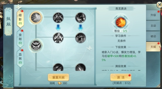 天赋主要可划分成三大类别,分别为:暗影、金刚以及血煞。