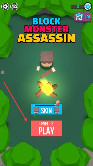 在游戏初始界面,找到标有“LEVEL”的选项,点击其中的红色“2PLAY”按钮,即可进入第二关的场景,接下来需要操控方块造型的角色,开启针对怪物的狩猎挑战。
