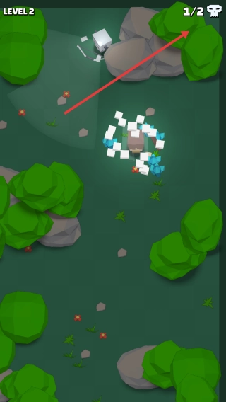 在游戏里,按照箭头指示移动角色,靠近并击败指定数量的2只怪物,以此推进关卡进度,同时注意观察右上角的怪物剩余数量计数。