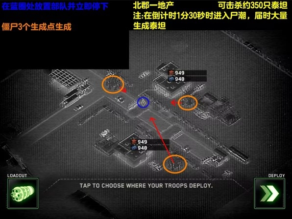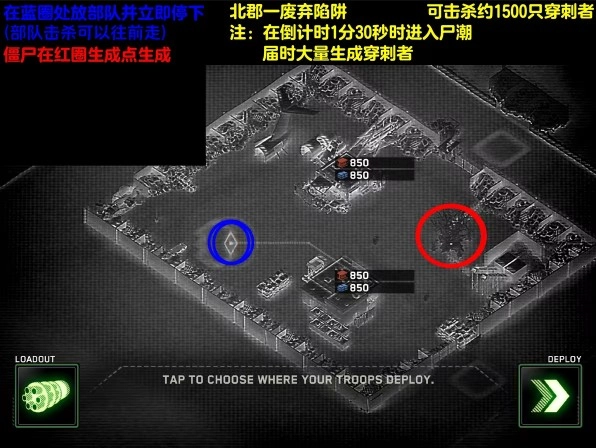 在蓝圈位置部署部队后即刻停下(若部队完成击杀则可继续前进)。