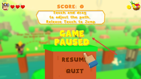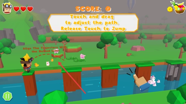 在游戏里,通过Touch and drag的拖曳操作来调整跳跃轨迹,松开后角色就会发起跳跃,你需要操控角色跨越河流、收集金币并避开各种障碍。