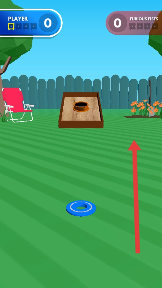 2、对准前方的木制目标板,通过【向上滑动屏幕】的操作,把蓝色垫圈投掷出去,力求让垫圈落在板上,或者投入中间的孔洞里。