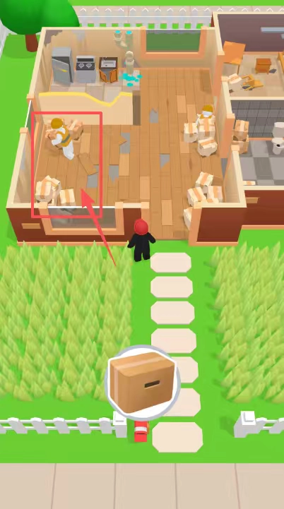 3、指示黄发工人搬运纸箱,依照箭头所指方向整理包装物品,并修缮房屋框架以及破损的墙壁结构。