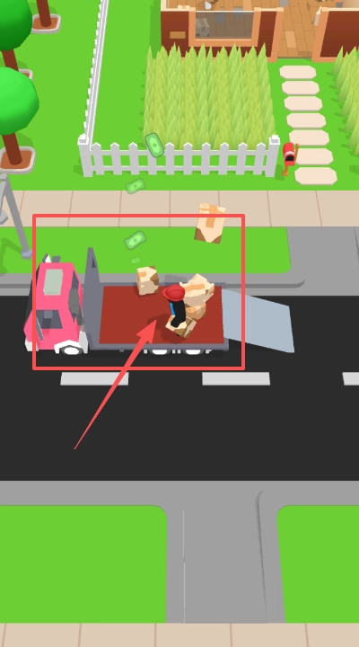 4、点击粉红卡车的棕色车厢,依照提示卸下浅棕色箱子,接着用卡车把材料运输至草地栅栏建筑的旁边。