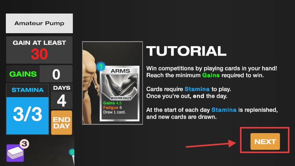 3、依照教程熟悉出牌及体力规则,点击【NEXT】,待掌握玩法后,开启健身挑战。