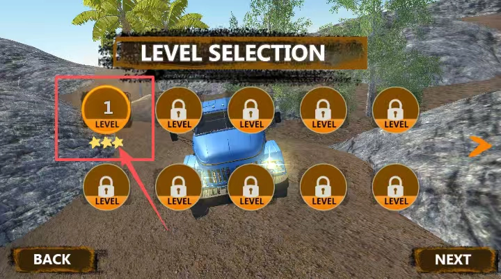 3、在“LEVEL SELECTION”中,挑选橙色1级关卡,随后开启越野挑战的解锁。