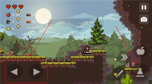 左下方的左右按键用于操控角色的左右移动,右下角则分布着角色的攻击键、跳跃键等功能按键。