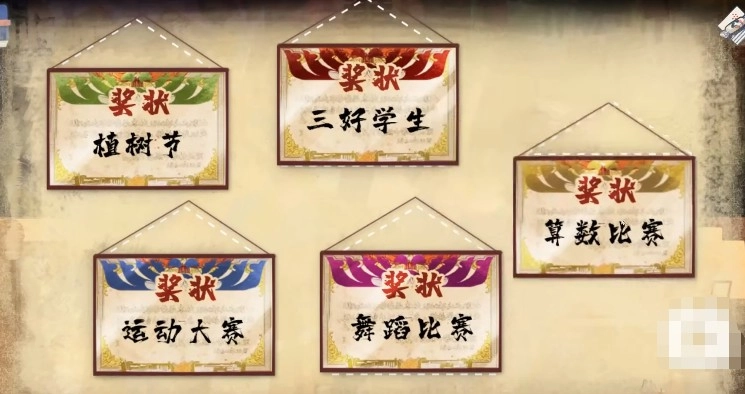 把奖状按照下图的排列方式摆放好,就能触发新的剧情了。