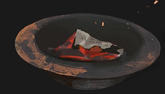 把之前收集到的所有道具全部焚毁,然后攀登上棺材来触发最终的剧情,这样就能从火盆里获取到那张纸条了。