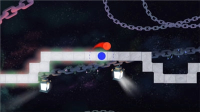 游戏采用单键点击的闯关玩法,玩家需要操控双星,让它们在赛道上有序地前行冒险。
