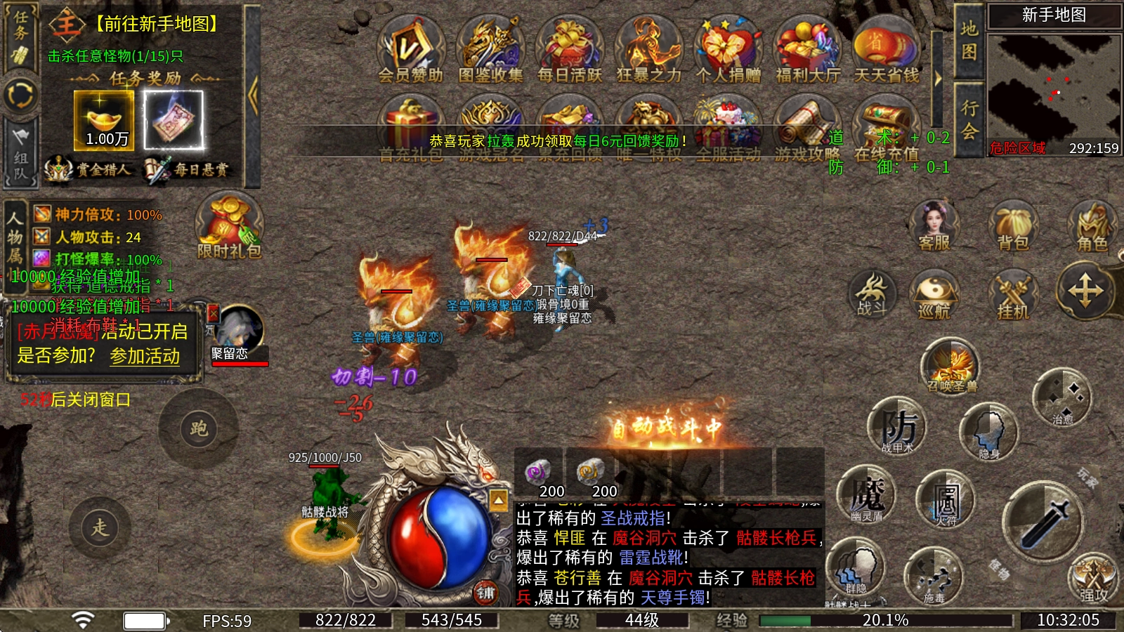 七日签到、在线奖励、新区首杀首爆等多样福利待你领取,海量元宝、材料与经验奖励拿到手软。
