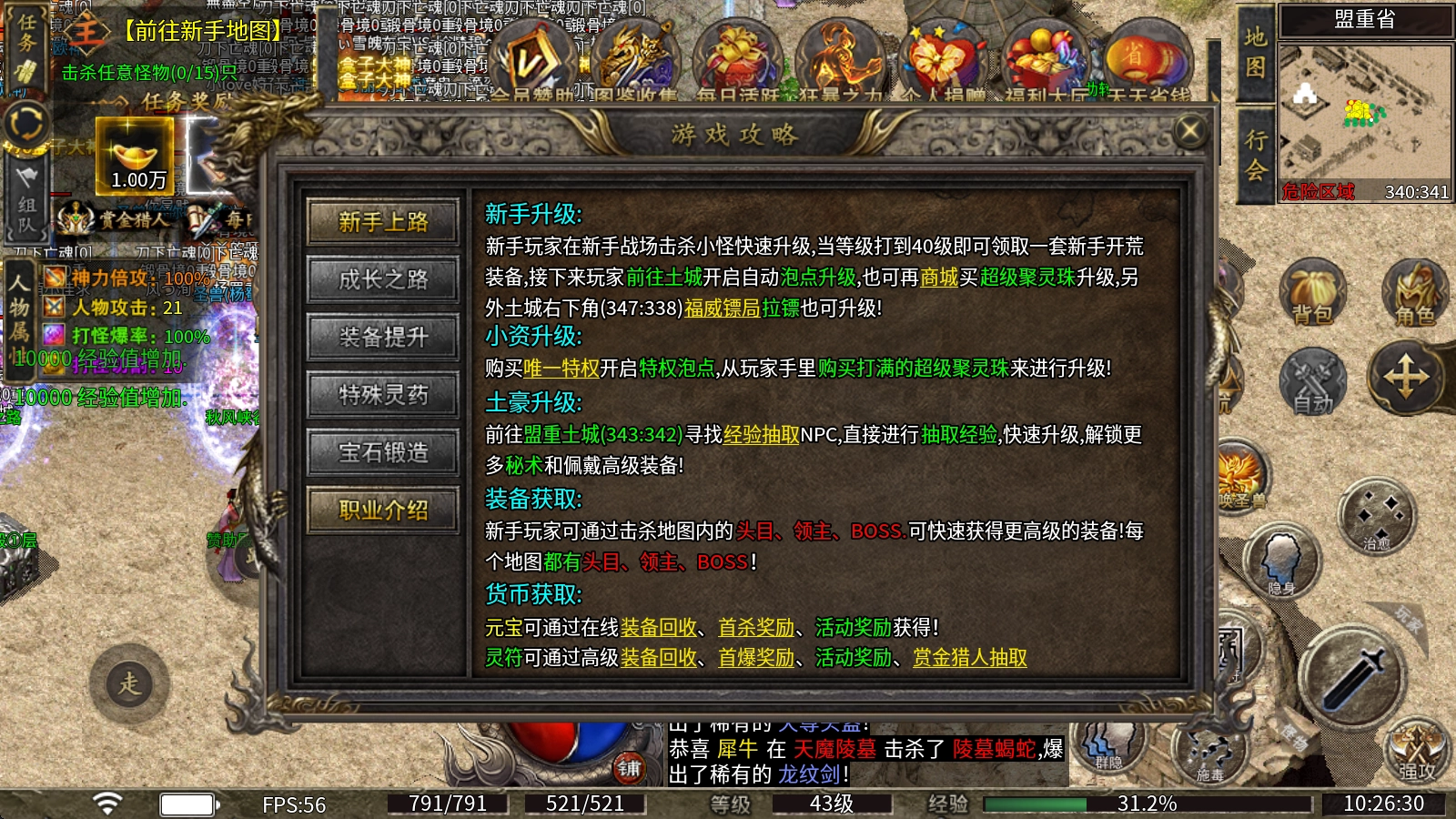 前往盟重土城(343:342)找到经验抽取NPC,直接抽取经验,就能快速升级,解锁更多秘术并佩戴高级装备!