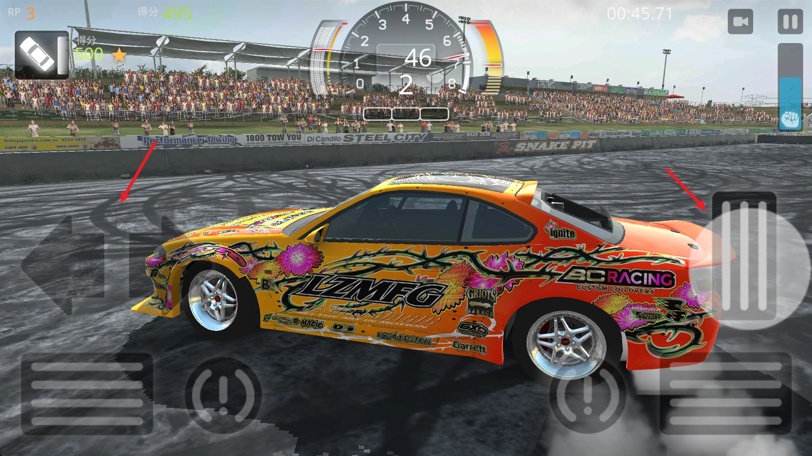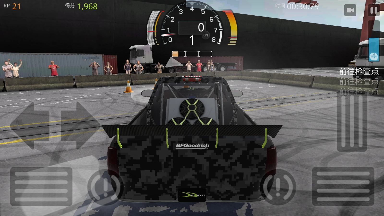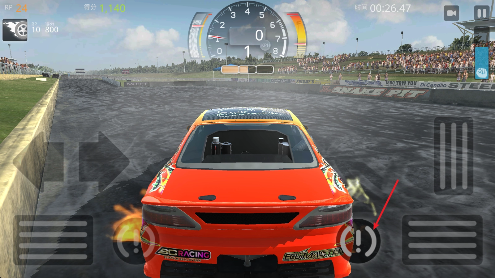 进入后,点击右侧的长踏板就能前进,左侧则用来控制转向和漂移。