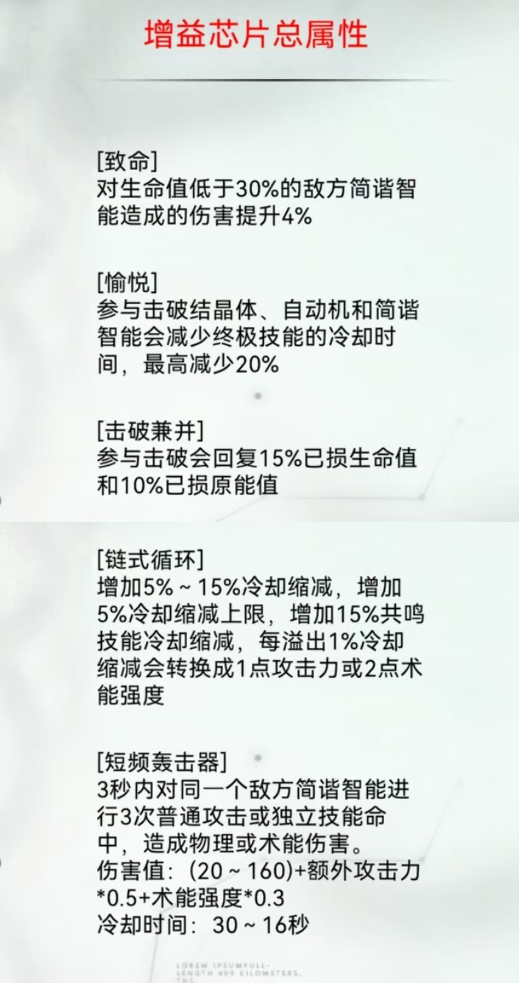 这里补充说明一下增益芯片【愉悦】的效果:它能减少大招冷却时间,通用性相当不错,而且叠加起来很容易。经过简单测试发现,攻击红蓝buff、河道野怪时会触发叠加,普通野怪则不会;击败敌方小兵或英雄也能叠加层数。不过叠加存在冷却时间,大概在3到5秒之间,每叠加一次可以减少大招0.8%至0.9%的冷却,叠满大概需要20多次(同类的其他增益芯片没测试过,效果应该大同小异)。
