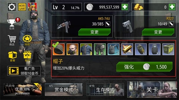 已经解锁的武器还能通过消耗银币来升级,并且子弹是实时消耗的,需要及时补充。