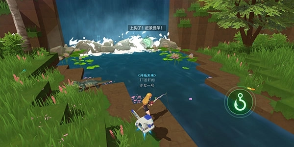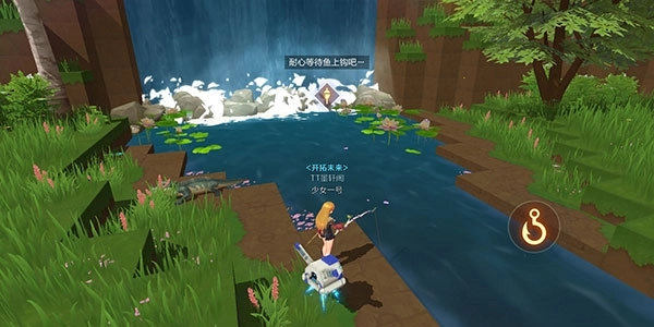 此时右手边会出现鱼钩图标,头顶则会显示浮标,这属于等待状态;当头顶的图标变成绿色鱼形,鱼钩也随之变为绿色时,就可以点击鱼钩开始钓鱼(鱼上钩后要尽快点击鱼钩,不然鱼会脱钩)。