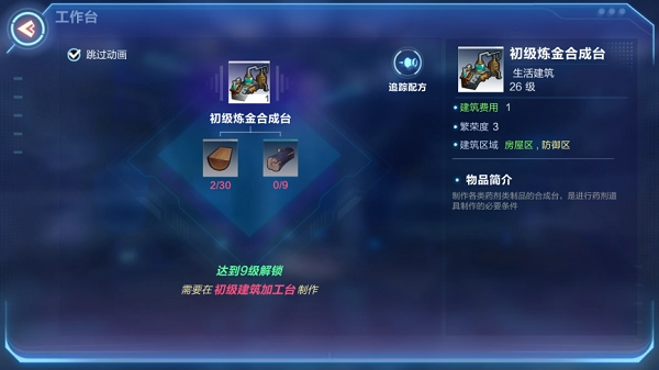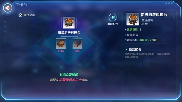 初级建筑加工台的制作材料为木材9份与星灯木9份。作为制作所有建筑类物品的核心前置设施,初级建筑加工台是解锁后续配方的关键基础,堪称最重要的配方之一。
