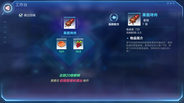 果酱烤肉的制作材料为兽肉块1份与红浆果2份,该食谱需等级达到20级方可解锁。作为战斗类食物,食用后能使生命上限提升758点,效果持续15分钟,同时饱食度增加720点。无论是刷副本还是完成任务,它都堪称必备之选。