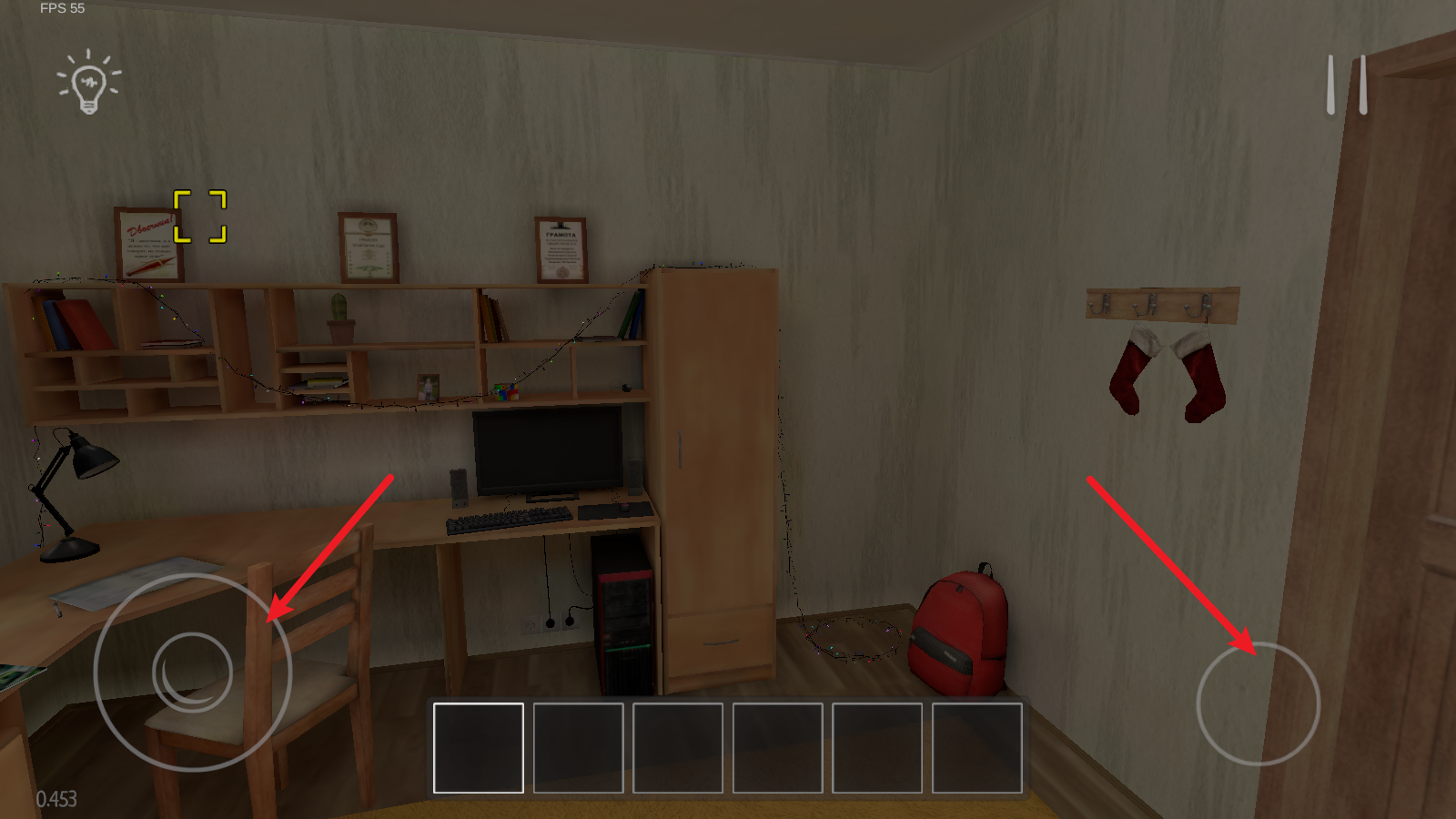 进入游戏后,你会出现在自己的房间里,左边的摇杆可以控制移动,右边的按钮能让你起身或蹲下。