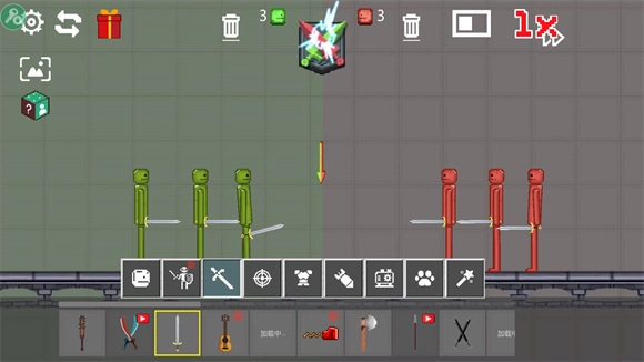 进入地图界面后,点击下方区域就能放置各类角色与道具,点击上方的红绿剑标志,双方便会开启战斗。
