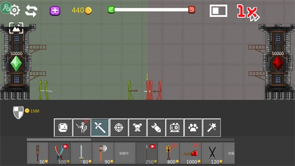 点击无尽战争模式,就能体验到紧张刺激的攻防对战。玩家得消耗金币召唤小兵,目标是摧毁对方的城堡;而击败敌方小兵,就能获取金币奖励。