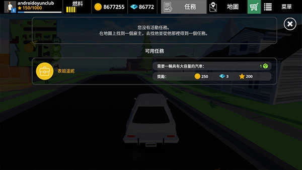 4、菜单栏上方依次排列着个人信息、汽车燃料、金币钻石、任务、地图以及商店。新手玩家不妨先点击“任务”,依照提示完成任务,从而获取经验。