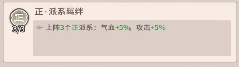 阵容羁绊:当队伍中上阵3个正派系角色时,全体角色的气血提升5%,攻击提升5%。